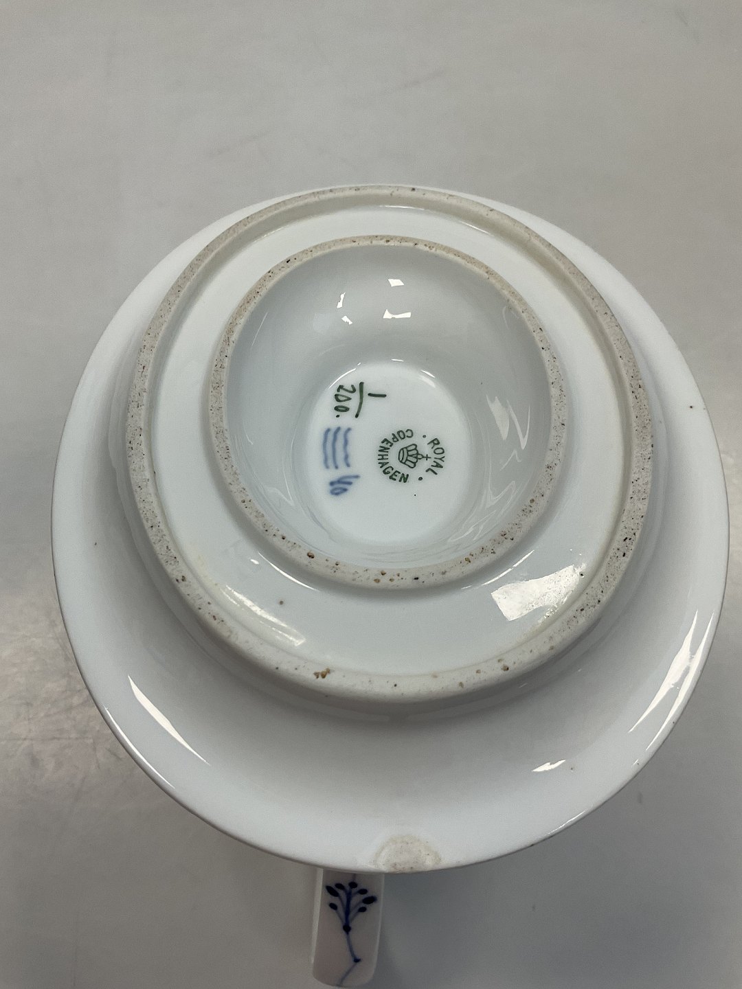 Royal Copenhagen Blue Fluted Plain Saucebowl with handle and saucer No 200. Measures 20 cm x 14 cm / 7 7/8 in. x 5 33/64 in.