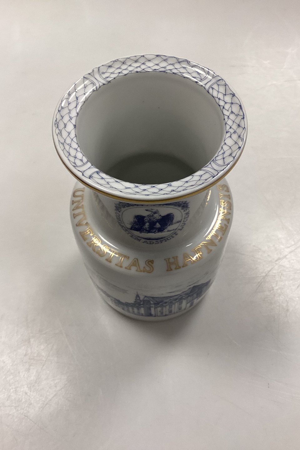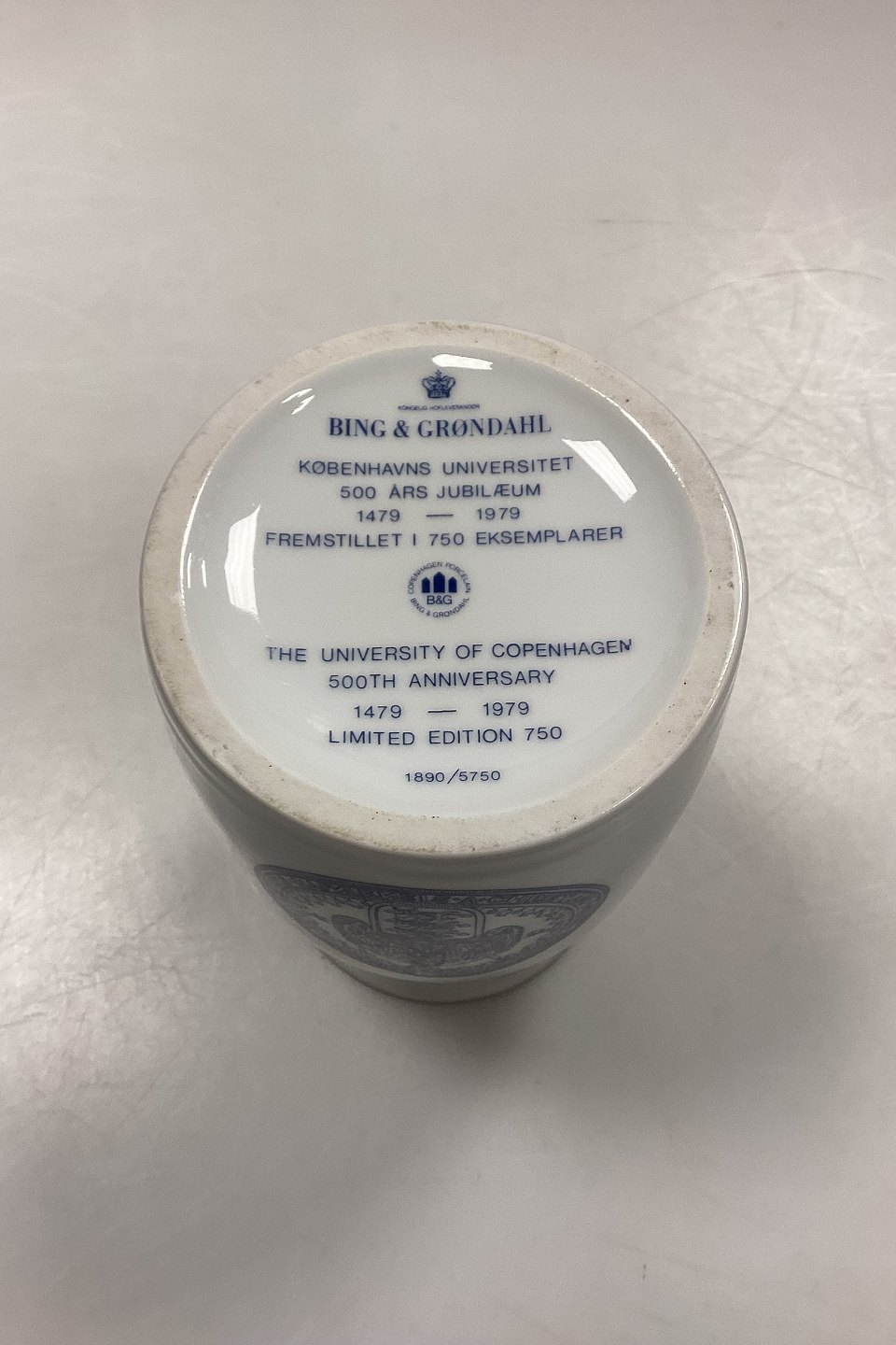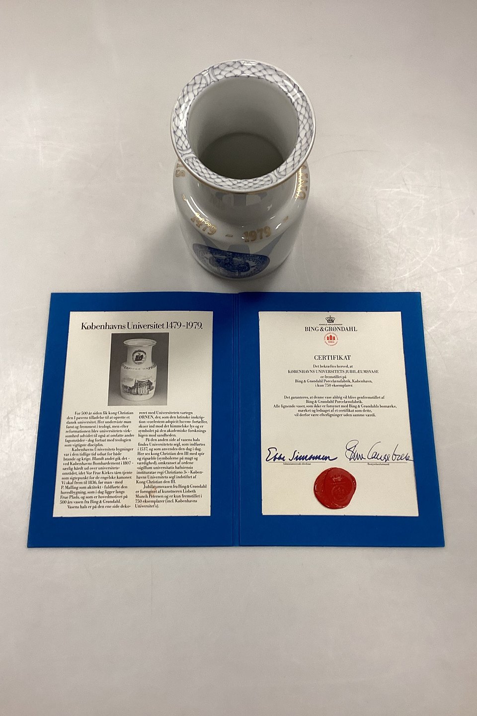 Bing and Grondahl Vase No. 1890/5750 - The University of Copenhagen 500th Anniversary. Produced in 750 copies. Inscription: Universitas Hafniensis - 1479 - 1979. Certificate included. Measures 18.5 cm / 7.28 in.