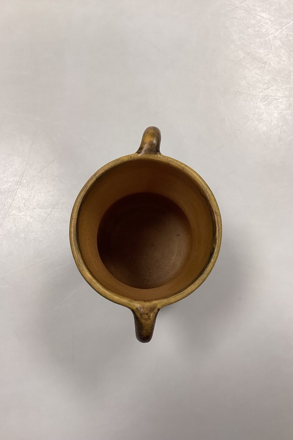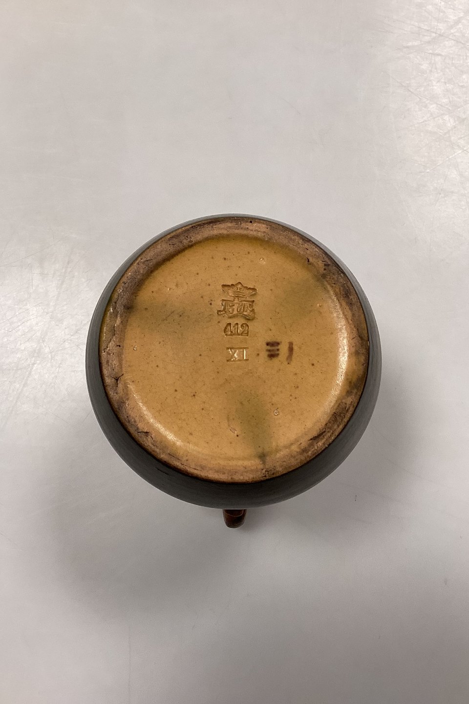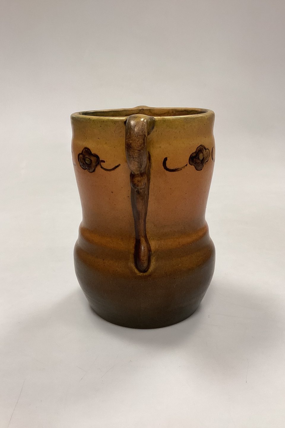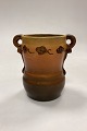 P. Ipsen's Widow Vase No. 412. Stoneware with yellow and brown glaze, with embossed flowers on the edge.