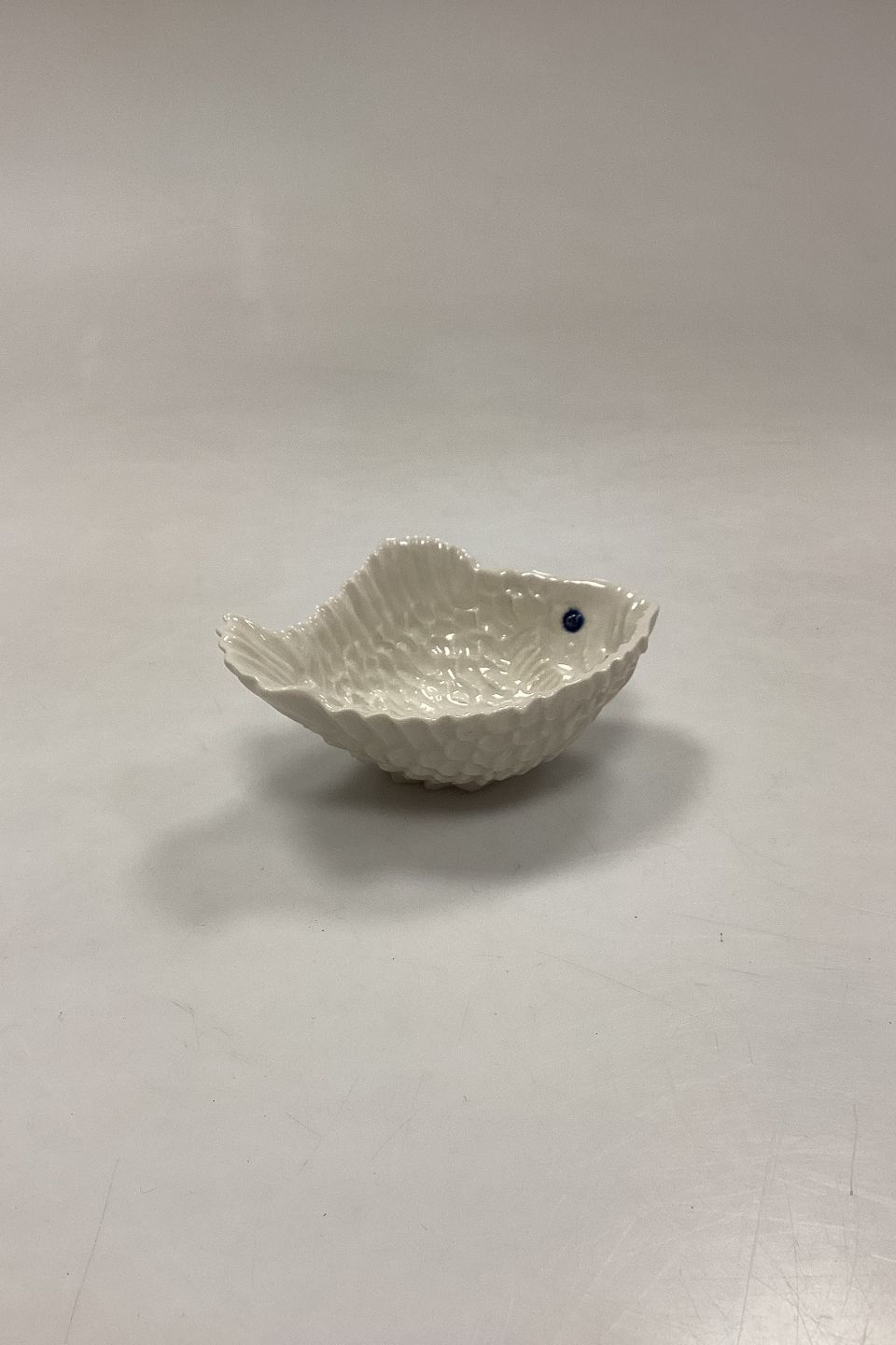 Royal Copenhagen Skål - Lille Fisk af Jeanne Grut. Hvidt stentøj med mørkeblå øjne. Signeret GRUT.