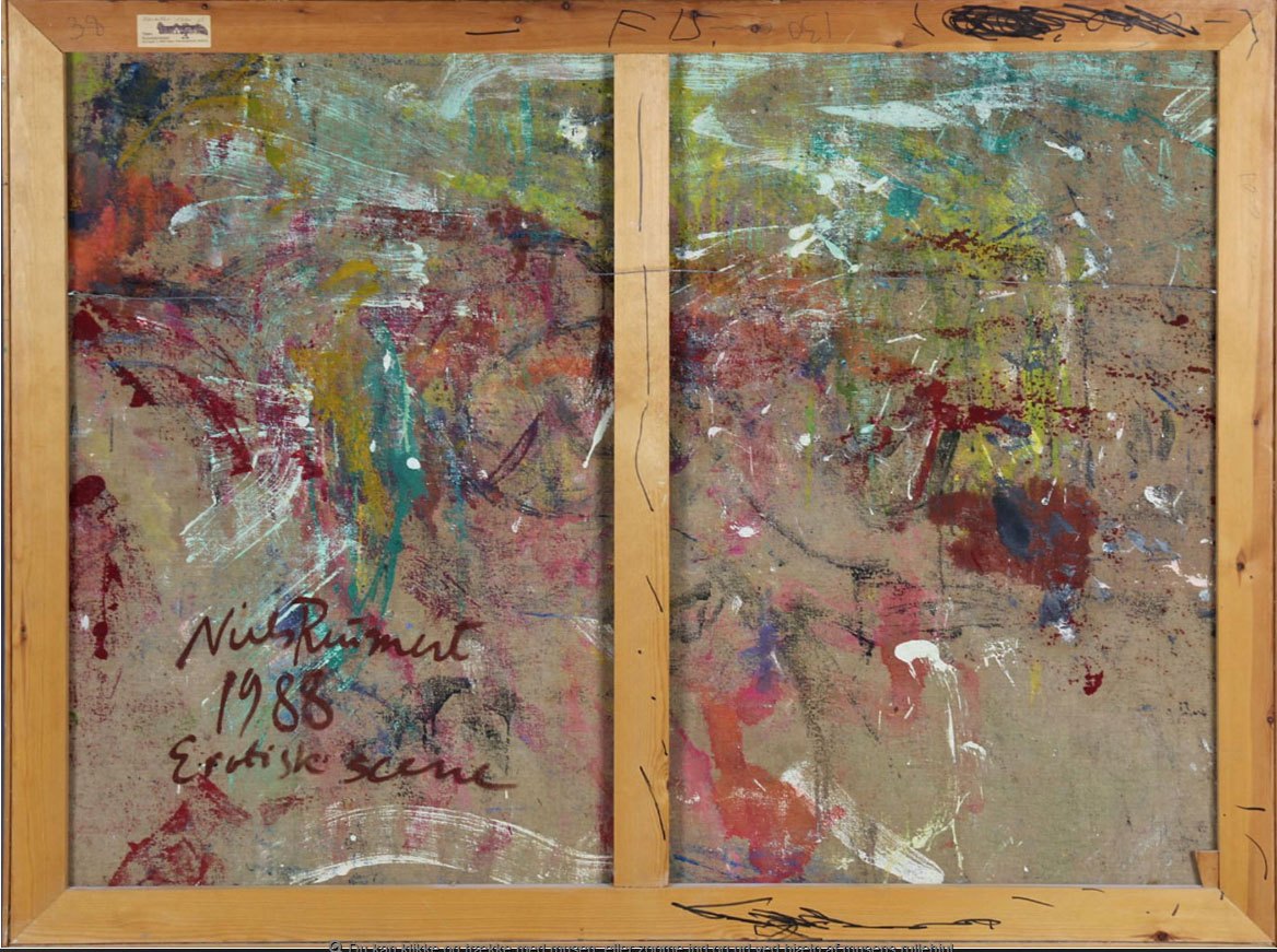 "Erotisk scene" Olie maleri på lærred. Monteret i flot forgyldt ramme.