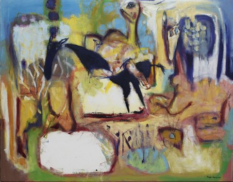 "Komposition" Olie maleri på lærrred, monteret i bred svæveramme.