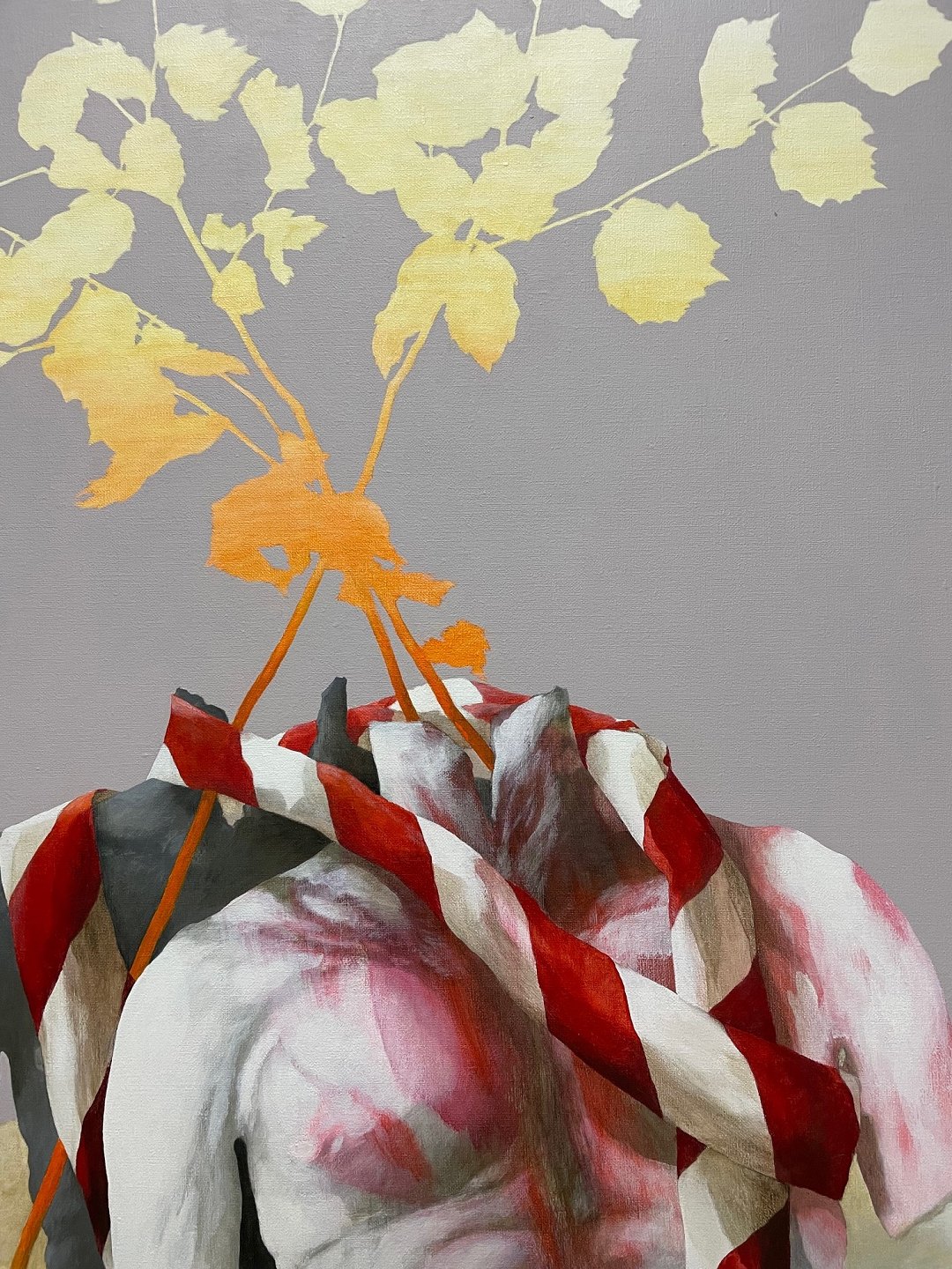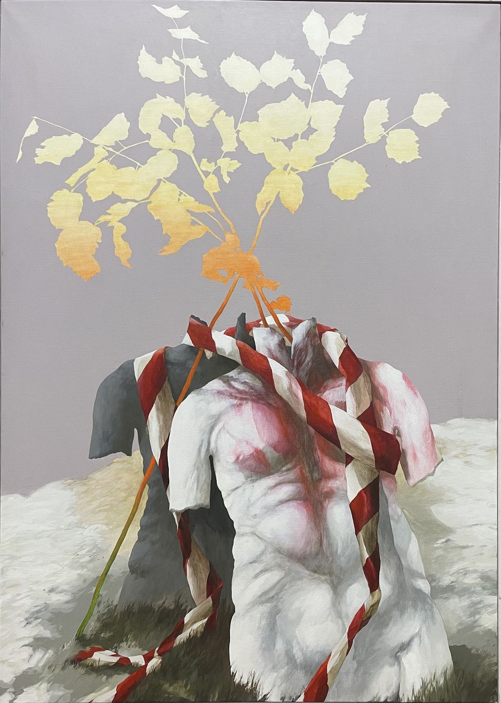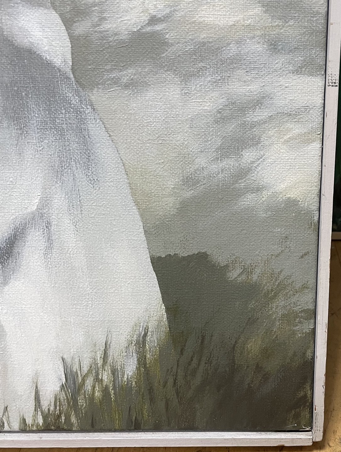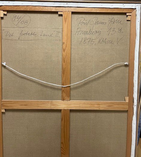 "det fortabte land" Stort flot surrealistisk oliemaleri i smal grå ramme.