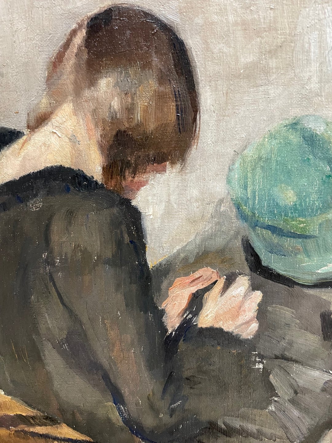"Interior with young woman" Oil painting on canvas in silver frame.