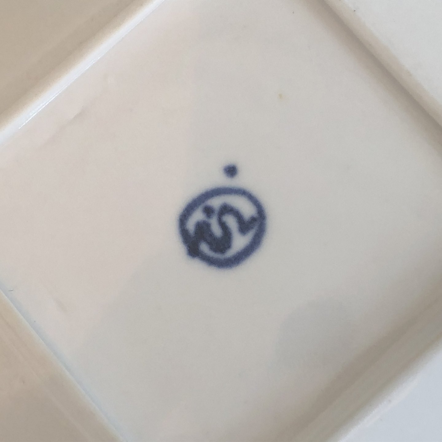 Water carafe and porcelain cup. Hour-shaped water carafe with onion H. 15 cm. Top 12 cm, bottom 11 cm. Cup or water cups with saucer: Cups H. 8 cm. D. 7.5 cm. Square saucer dimensions: 3.5 x 3.5 cm. Signed with blue monogran at the bottom S.