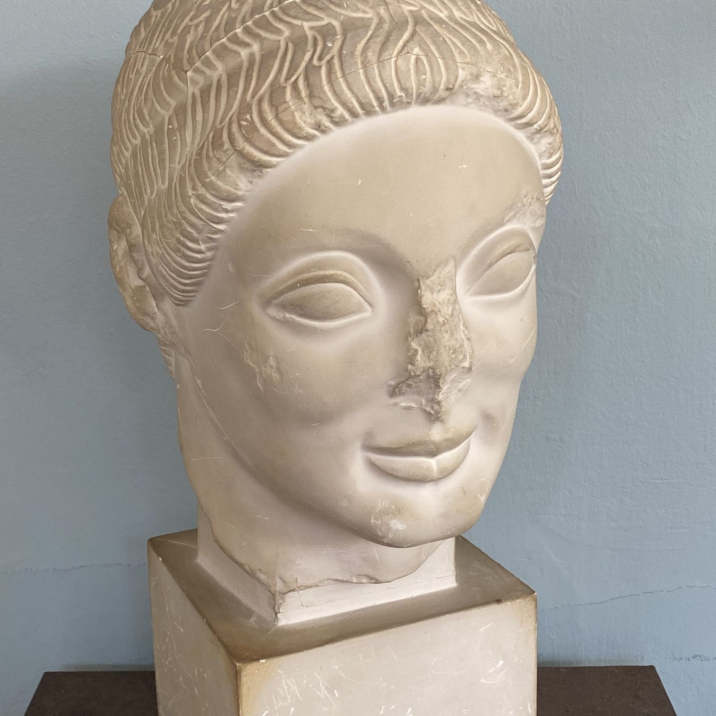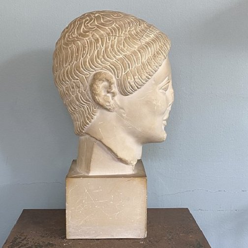 Gipsbuste. Afstøbning fra Glyptoteket af "Rayet hovedet" (ung mand),Grækenland d.6. århundrede.