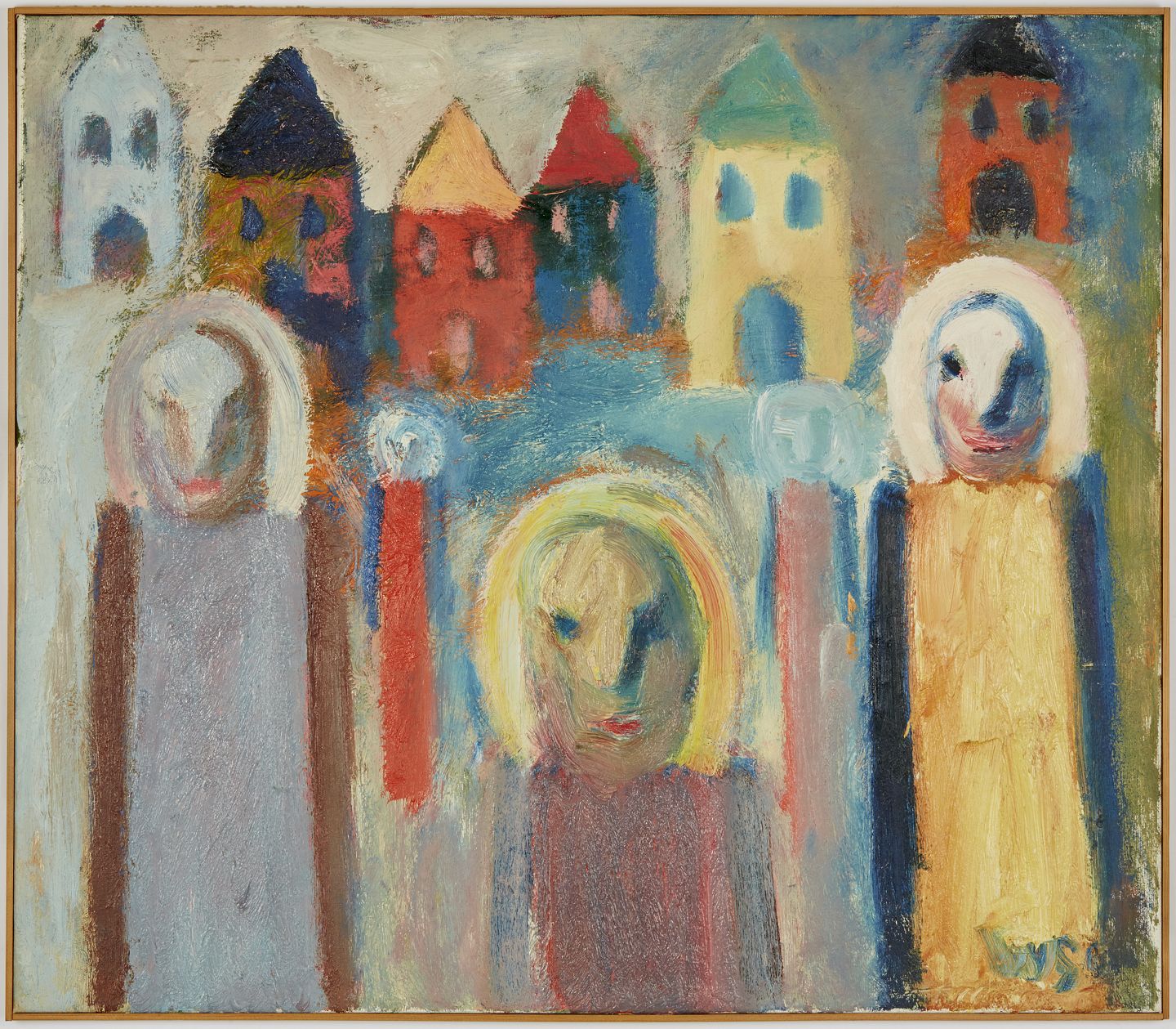 Smukt komponeret værk i skønne farver forestillende figurer og huse i landskab.