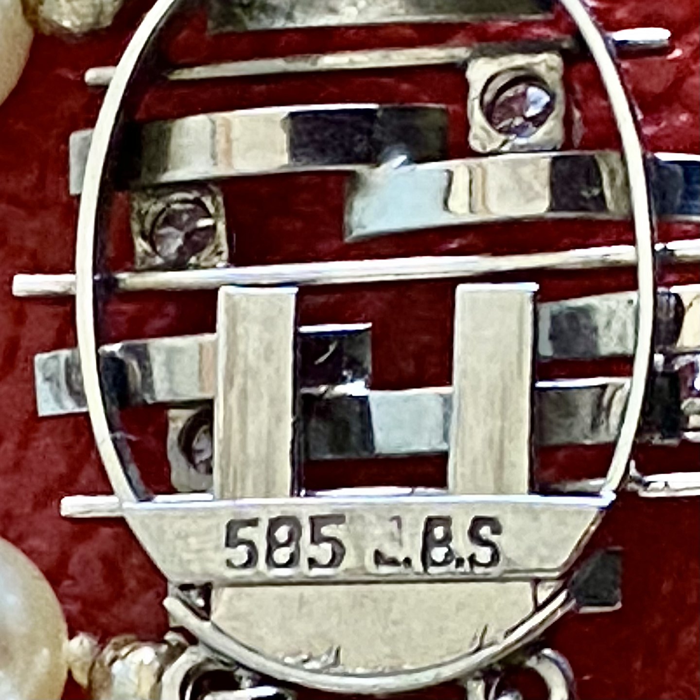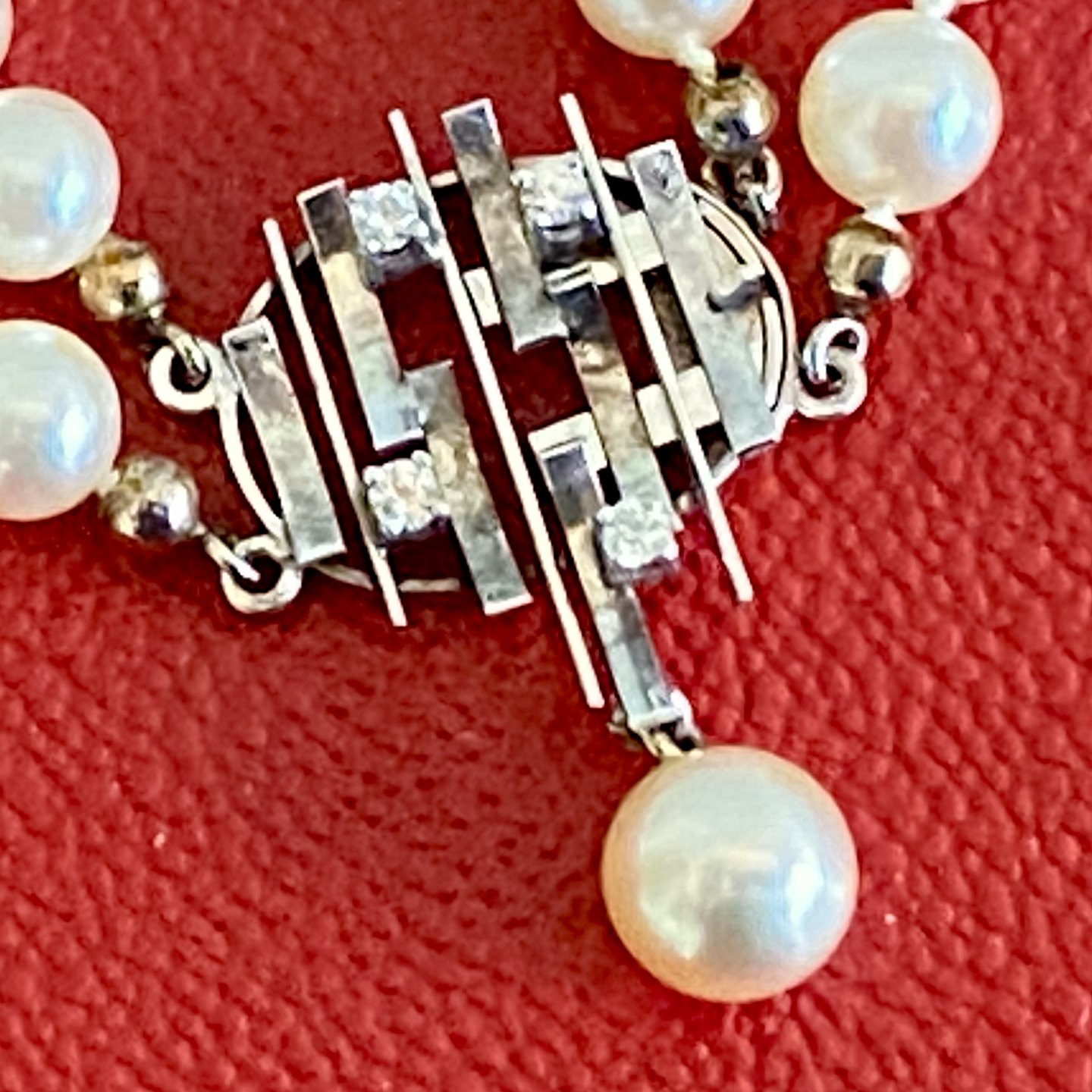 Halskæde med 126 på Ø 6 mm. kulturperler i forløb. Større perle på vedhæng af 14k hvidguld med 4 små brillanter på hver 0,3k.
