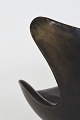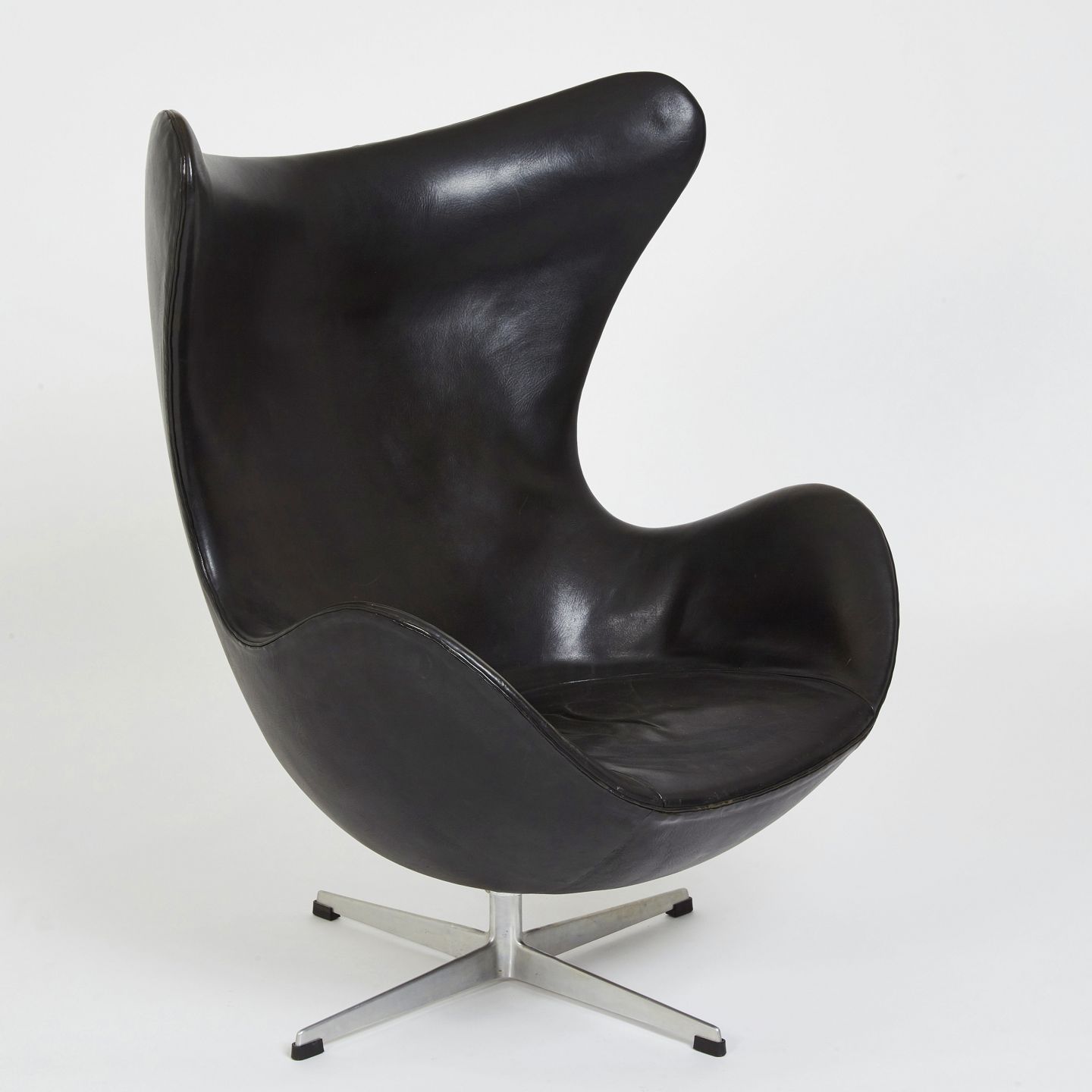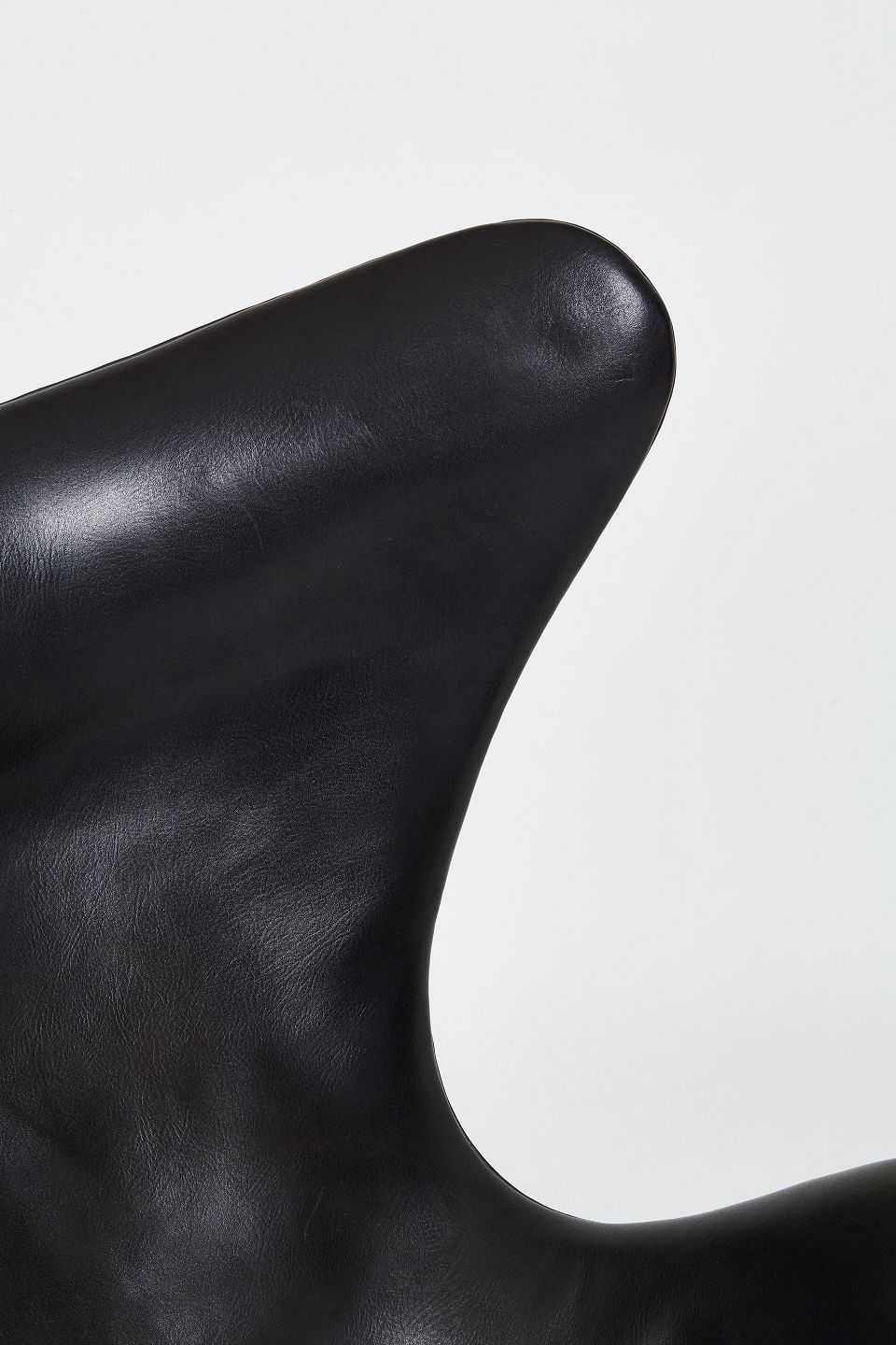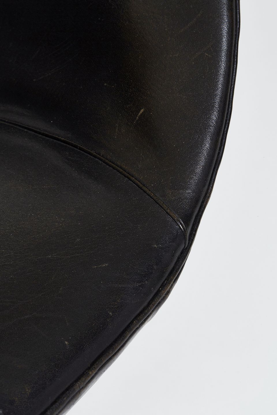 Stolen er betrukket med originalt patineret sort læder, monteret på drejelig midtersøjle samt helstøbt profileret fod af aluminium. Fremstillet hos Fritz Hansen , Formgivet i 1958-59 som en del af totalindretningen i Hotel Royal København.