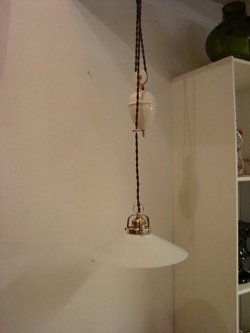 Gl. Skomagerlampe i porcelæn med original hejs og brun stofledning