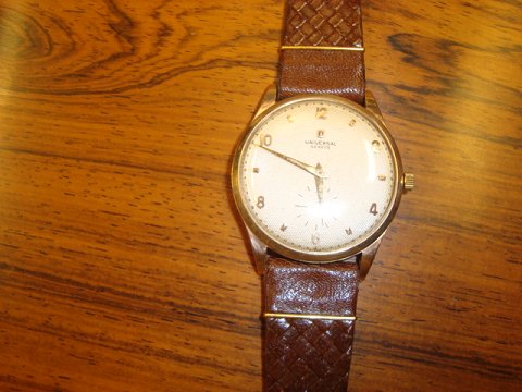 UNIVERSAL, Geneve 18 k guldur med flet læderrem, virkelig flot og elegant. D 38 mm.