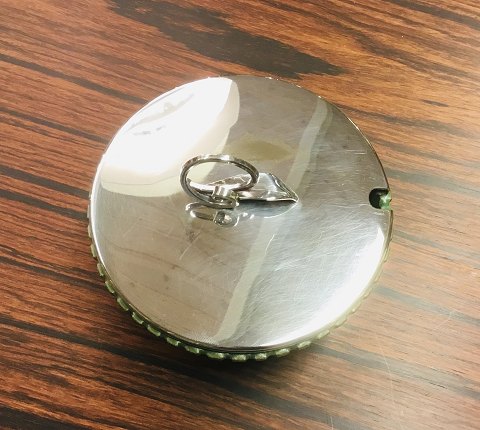 Arne Bang skål af stentøj med sølvplet låg, modelleret med riflet korpus, dekoreret m. grønlig fugleæg-glasur H 4,7 D 12,0