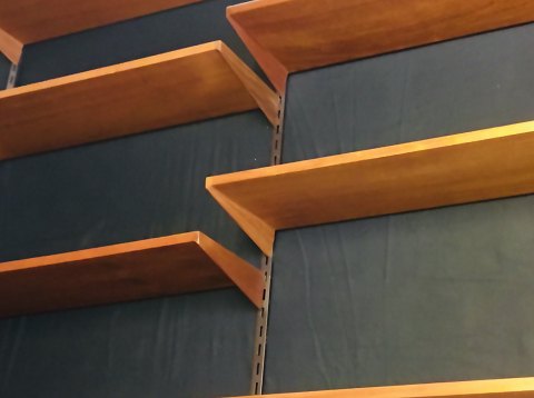 FM Furniture teak reol, design Kai Kristiansen i meget fin stand. 8 hylder på 24 cm a kr. 600 og 3 vægskinner a kr. 200