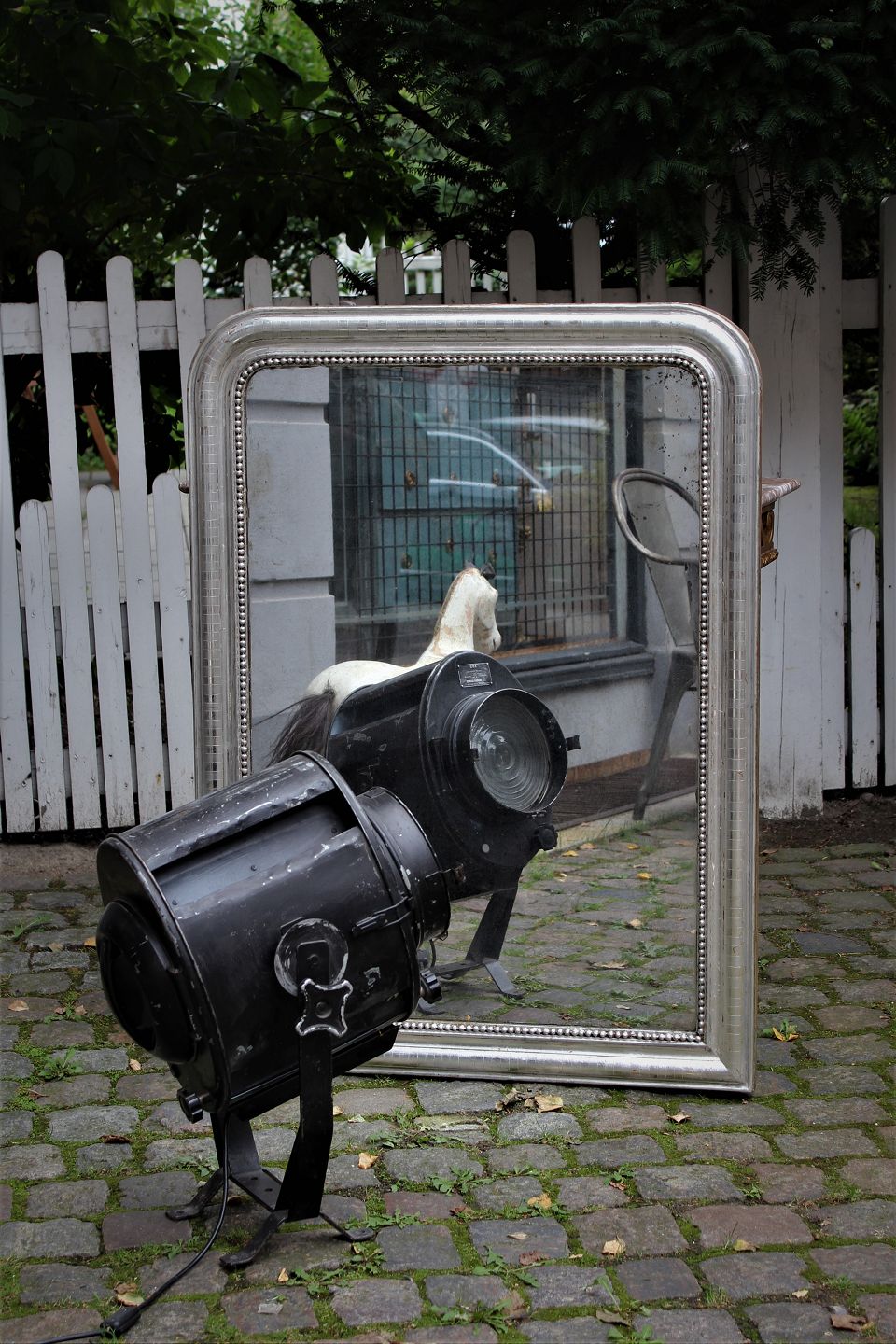 Gammelt fransk 1800 tals Louis Philippe sølv spejl med fin dekoreret sølv ramme , perlekant , gammelt spejlglas og en fin patina.