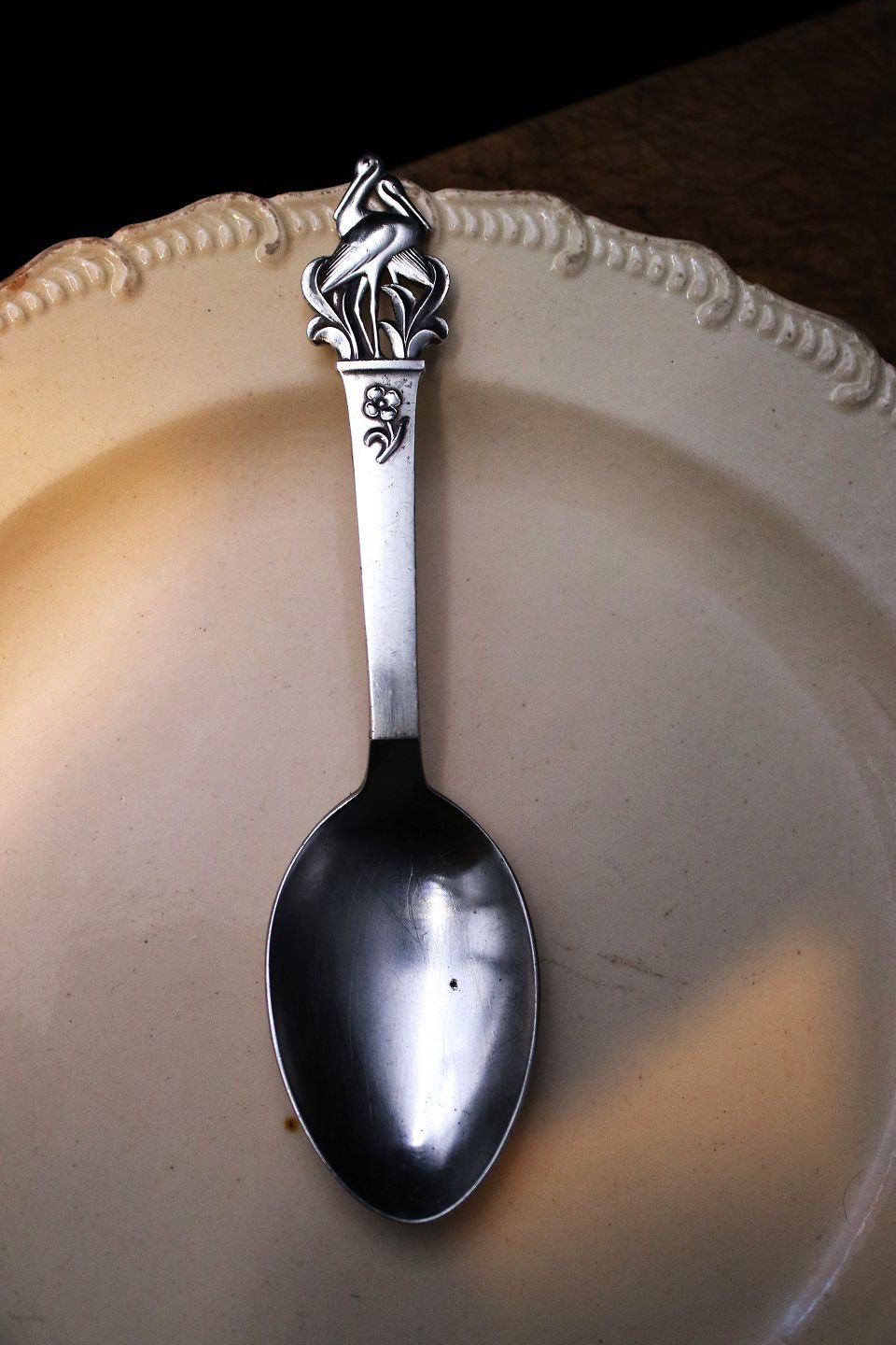 Gammel barneske i 3 tårnet sølv med storkemotiv , stemplet. Længde: 16cm.