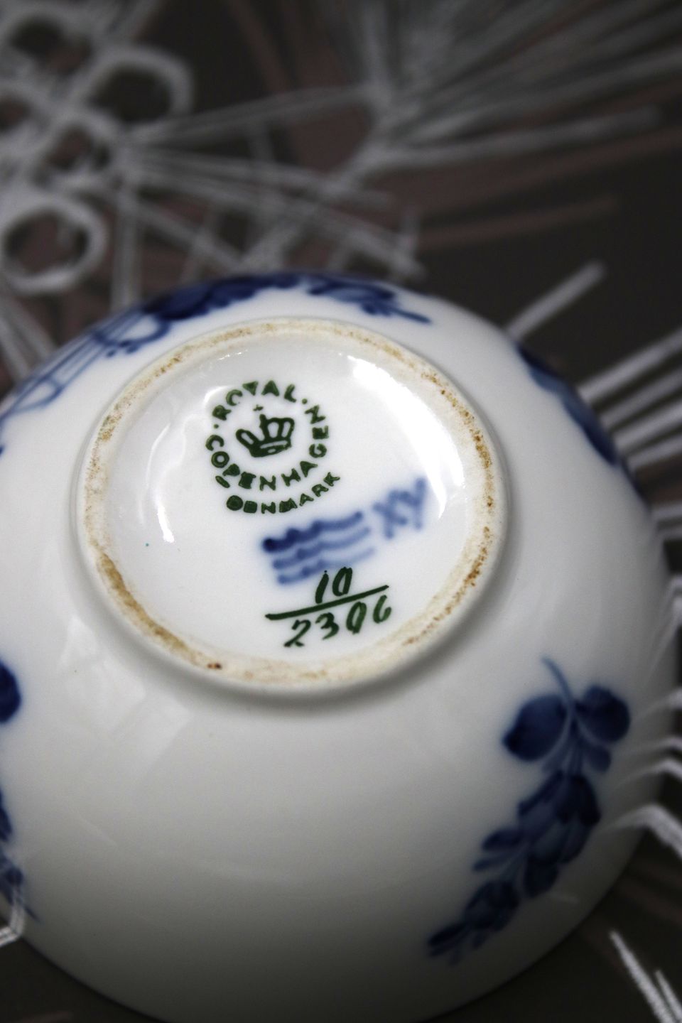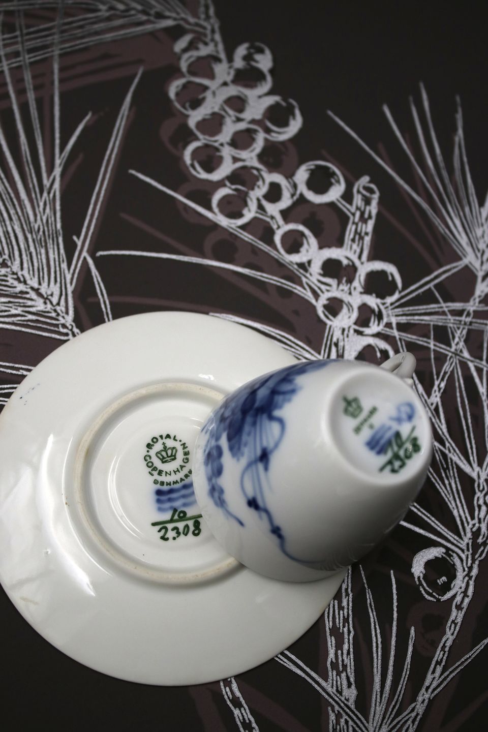 2) Coffee cup: Decoration number: 10/2308. 1st variety. Cup Dia.: 4.8cm. saucer Dia.: 9cm. PRICE: 400 DKK. per piece.