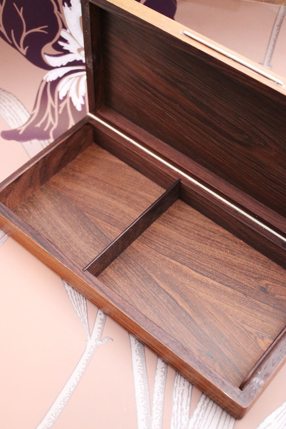 Oblong box in rosewood decorated with silver inlay with a motif of a small elephant carrying a tree trunk...