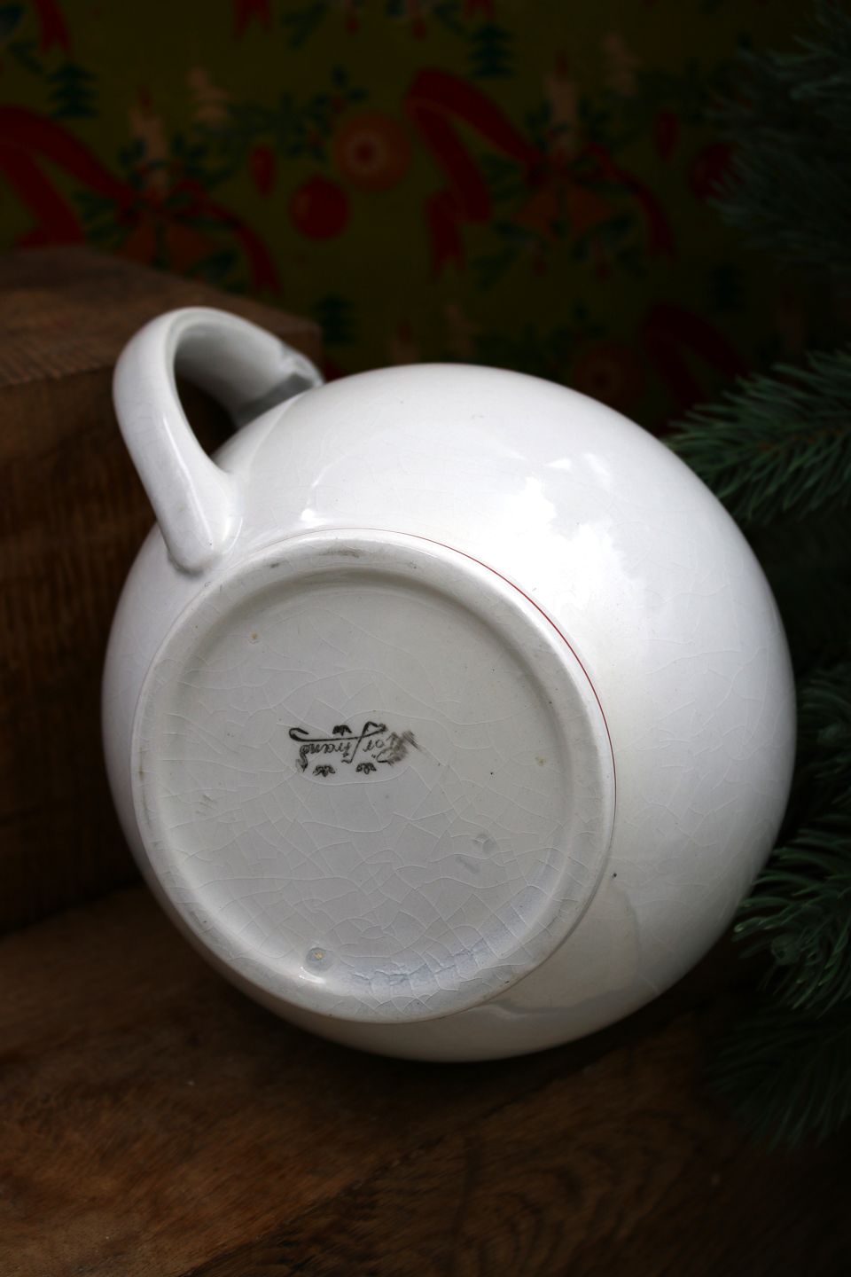 STOR gammel svensk "Herregårds" julekande i fajance med nisser på hældetuden og på hanken. H:15m. Dia.: 17cm. L: 22cm.