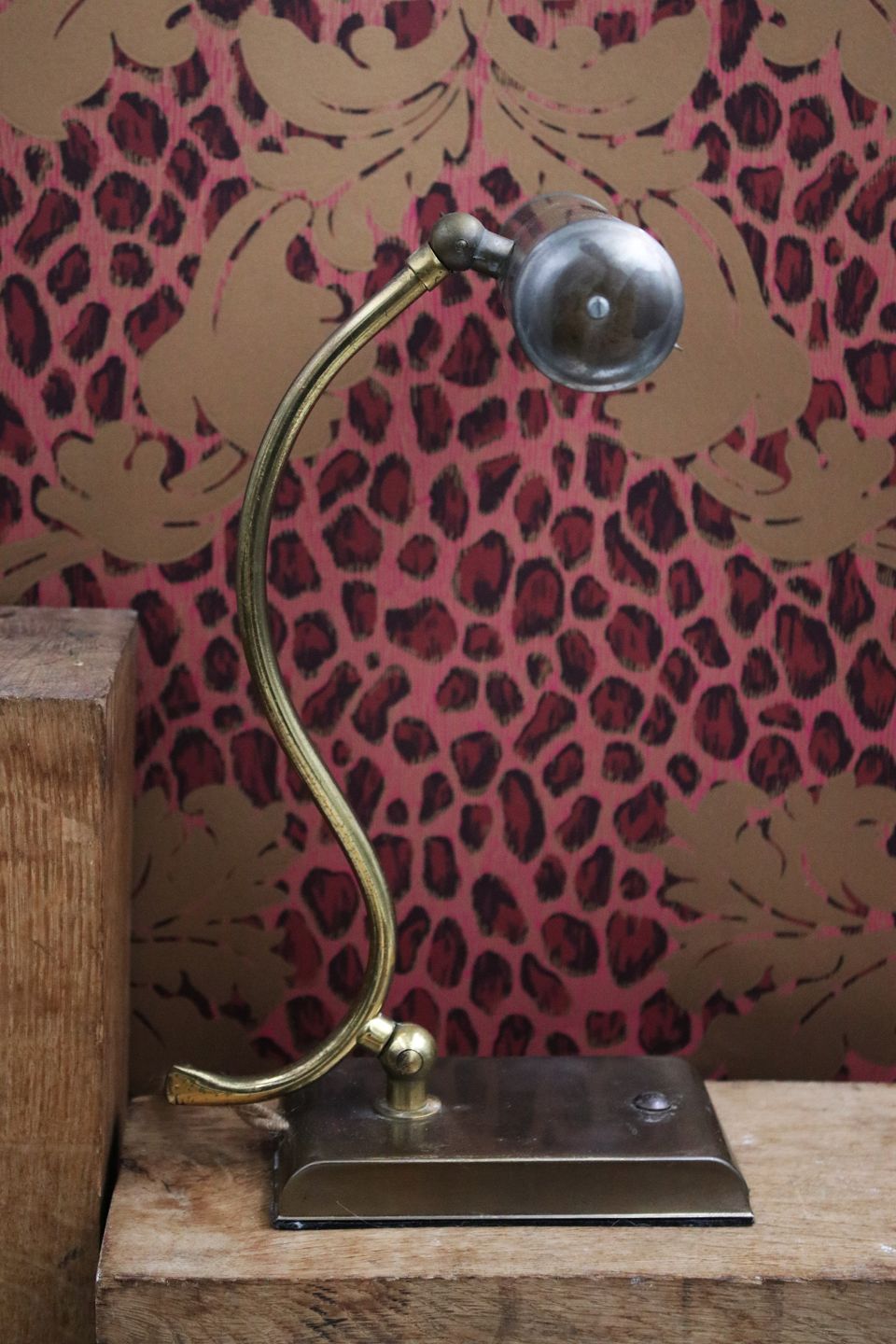 Gammel skrivebordslampe i patineret messing. H: 31cm. Skærm Dia.: L: 20,5cm. Dia.: 4,5cm.