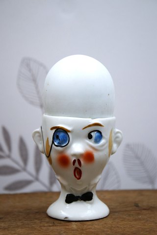 Gammelt æggebægre fra 30érne i porcelæn med bemalet sjovt ansigt. Højde: 6,5cm. Emne nummer: Æggebægre nr.15