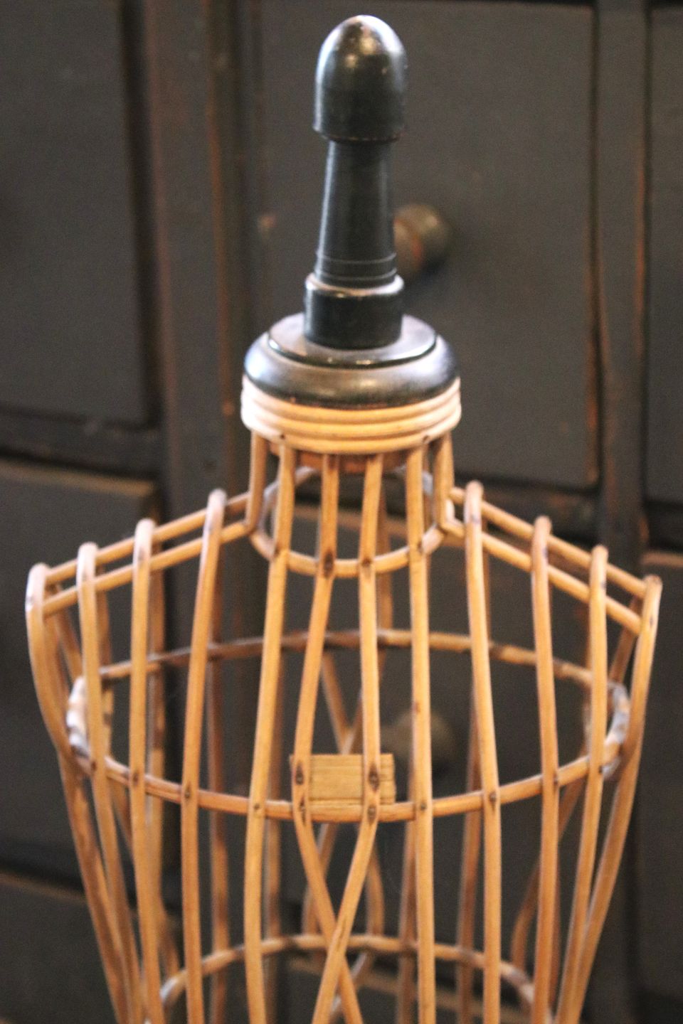 Decorative, old French Napoleon III mannequin in woven rattan with black wooden boots and a fine patina. Height: 90cm.