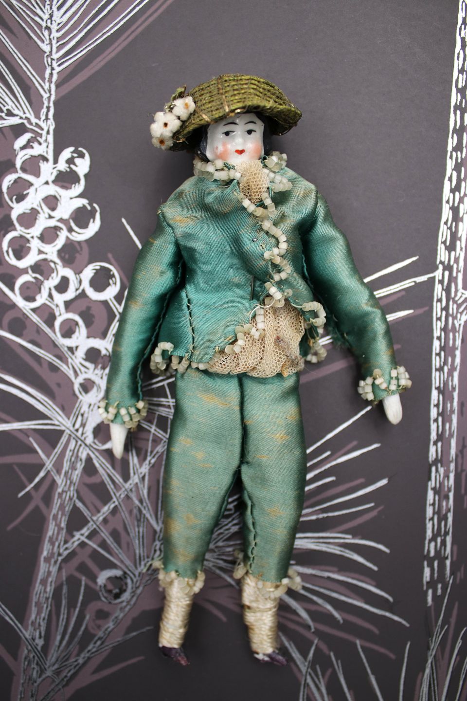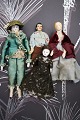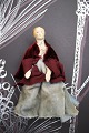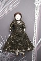 1) H: 19cm. Lady with head, hands and feet in porcelain, body in fabric and dressed in old silk clothes and hat. - PRICE: 700 DKK. RESERVED!