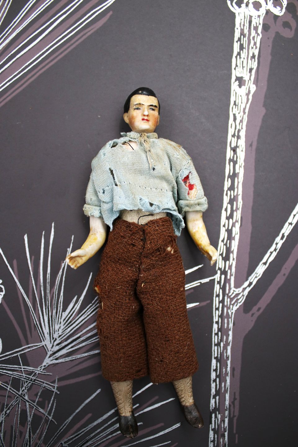 4) Man with head, hands and feet in porcelain, body in fabric and dressed in old fabric clothes. - PRICE: 400 DKK.