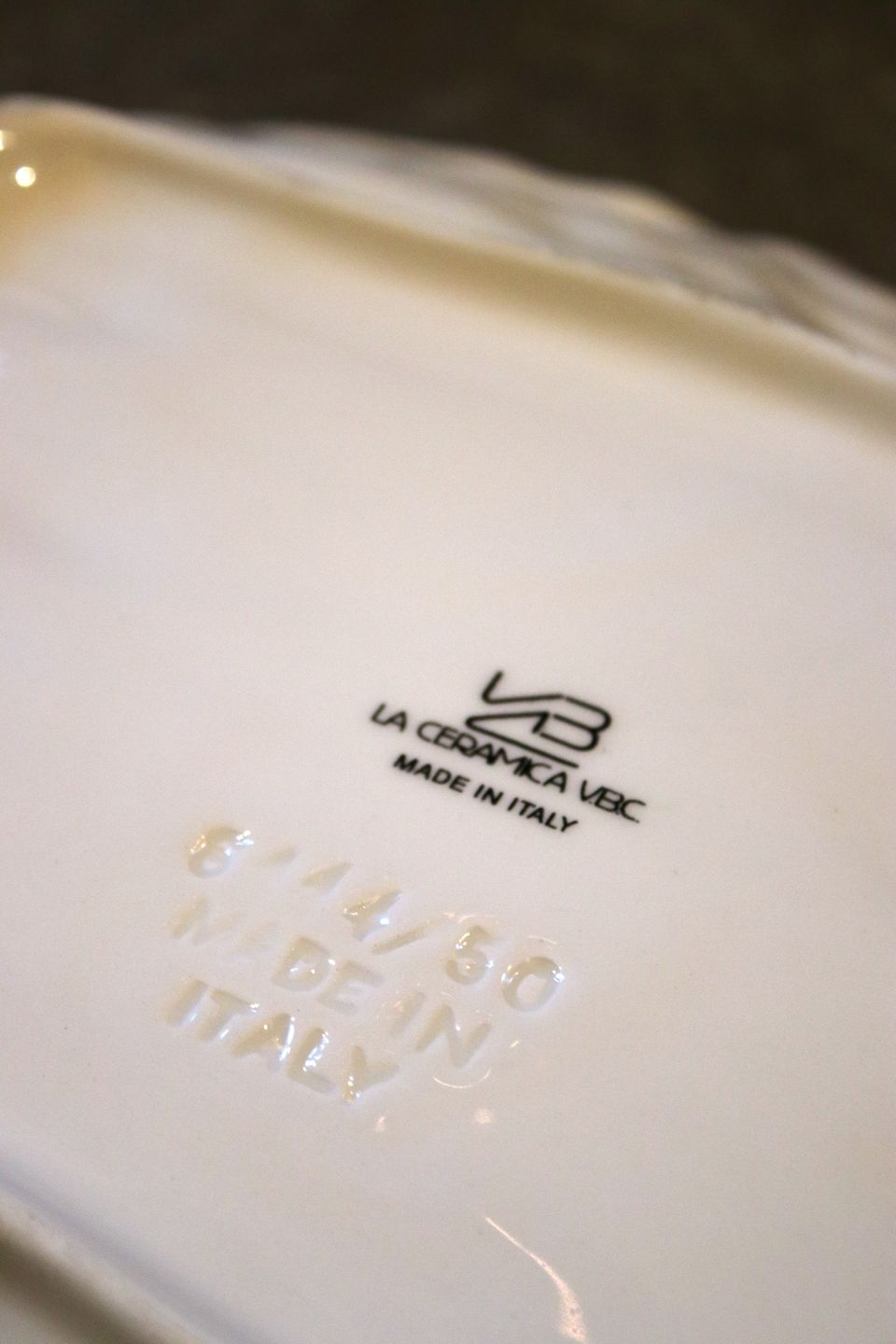 Gammelt italiensk fajance fad med salatblade og blomkåls dekorationer.