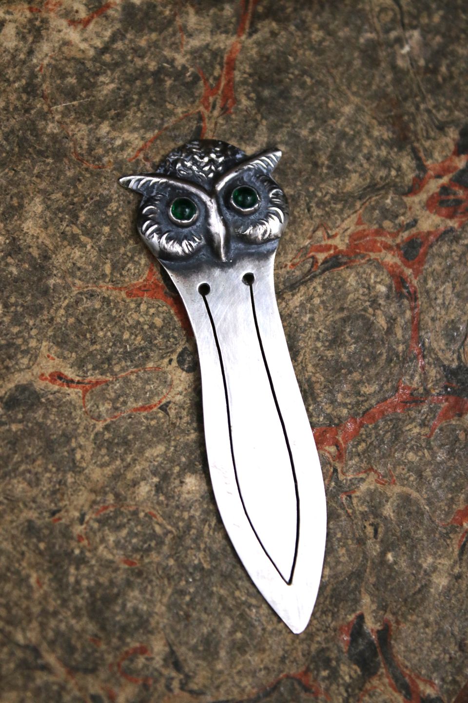 Old silver bookmark in the shape of a small owl with green glass eyes. Stamped 830s. Length: 5.8cm. Item number: Bogmærke nr.4