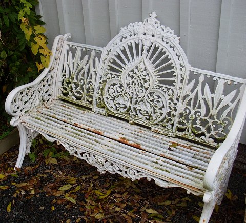Smuk engelsk, 2 personers havebænk i støbejern fra 1800tallets slutning. Bemærk sædet også er i jern!