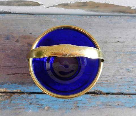 1800tals sukkerskål i blåt glas med messing hank.