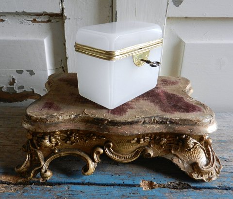 Meget eksklusivt 1800tals sukker/kandis skrin i hvid opalineglas med forgyldt bronze montering. Skrinet fremstår med nøgle, meget usædvanligt at nøglen følger med.