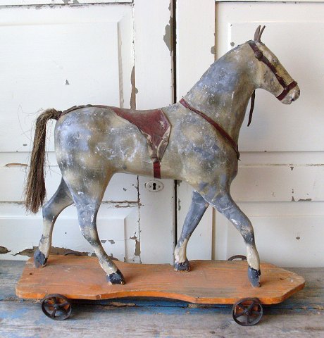 Stor grå legetøjs hest fremstillet i træ og papmache.