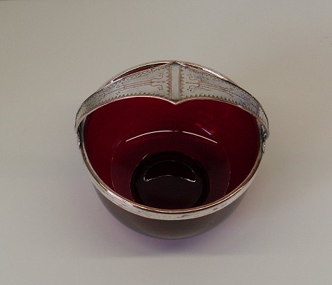 1800tals sukkerskål i rubinrødt glas med forsølvet hank.