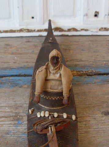 Grønlandsk kajakmodel udført i skind, træ og ben. Længde 45cm.