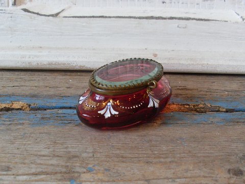 Smukt 1800tals smykkeskrin i hindbærfarvet glas med emalje bemaling.
