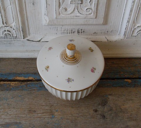 Lyngby bonbonniere dekoreret med guld og små blomster buketter. 1. sort. Højde 16,5cm. Diameter 15cm.