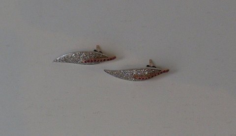 Pair of ruby and diamond studs in 8 kt rhodium-plated gold adorned with 20 round rubies in total approx. 0.44 ct and numerous round, faceted diamonds totaling approx. 1.32 ct. Colour: Top cape (K-L)-Light yellow. Clarity: P1-P3. Length 3.5 cm |