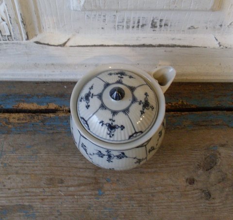 Royal Copenhagen Musselmalet riflet antik flødepotte på tre ben med dyrepoter, lågknop som blomsterknop.
