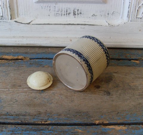 Smuk 1700tals tedåse i fajance med enkel blå dekoration. Fremstår med hårrevne samt små afslag. Højde 11cm. Diameter 8cm.