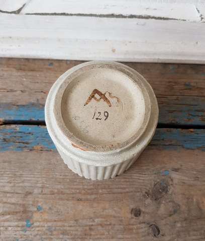 Arne Bang - riflet vase no. 129 i lysegrå glasur. Fremstår med små glasur afslag - se billed. Signeret AB 129 Højde 9 cm. Diameter 9 cm. Perfekt stand