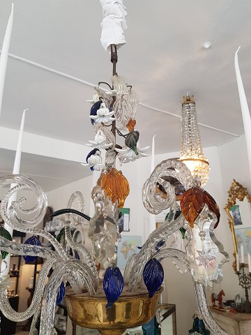 Fire lysarme, otte svungne arme prydet med talrige kulørte prismer, blade og glas blomster.