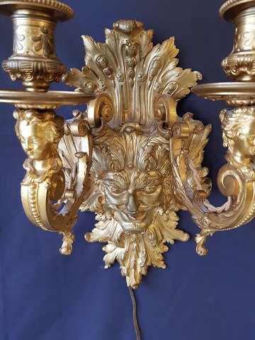 Mascaron med svungne lysarme prydet med smukke kvinde ansigter.