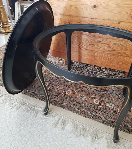 1800tals bakkebord, bakken er sortlakeret papmache med gulddekoration. Stellet er i sort/guld bemalet træ.