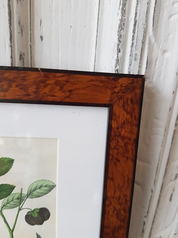 1800tals håndkoloreret tryk med blomster i smuk fineret træramme