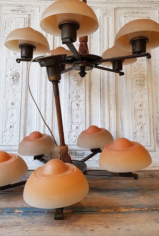 Fogh & Mørup femarmet lofts lampe i bruneret messing med "spejlægs skærme"
