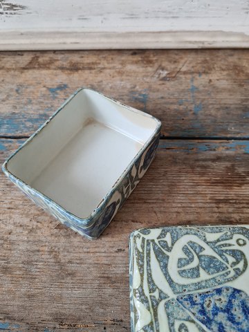 Aluminia Tenera lågdåse dekoreret med fugl. No. 716/3104, 1. sort. Mål 8,5 x 10 cm. Højde 6 cm. Fremstår med lidt misfarvning invendigt - se billed.