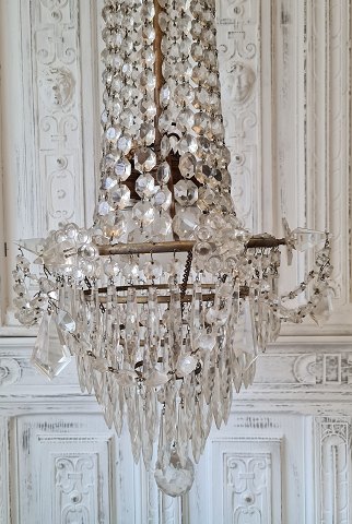 Stor smuk gammel prismelysekrone med tre lyskilder. Fremstår i flot stand. Højde 90 cm. Diameter 36 cm.