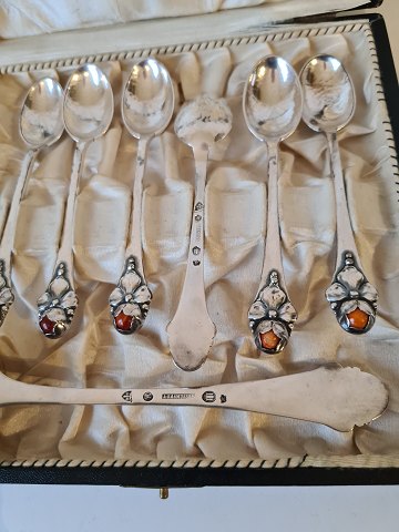A.Rasmusse sæt på 6 skønvirke kaffeskeer samt flødeske i hammerslået sølv med ravperler år 1920.