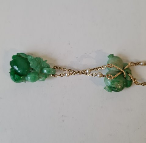 Necklace in 18 kt gold with beautifully carved jade and Akoya pearls. Appears without stamps - is acid tested to a value of 18 kt.